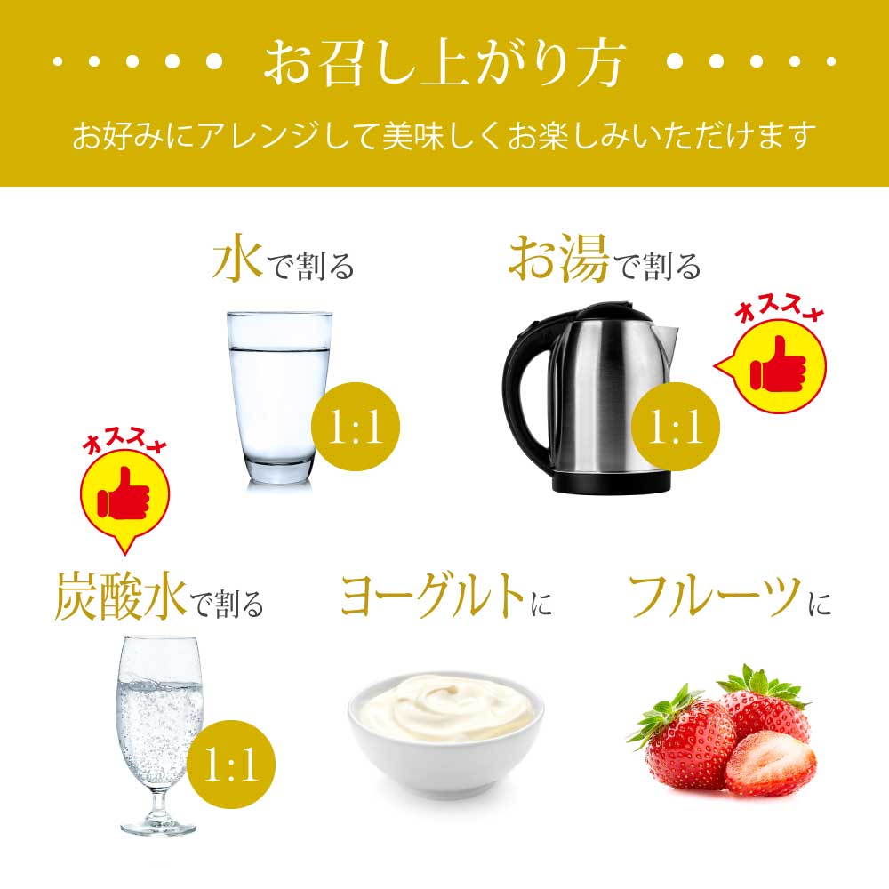軽く振ってお飲みください。水やお湯で割ったりヨーグルト等に混ぜてもおいしくお召し上がりいただけます。
