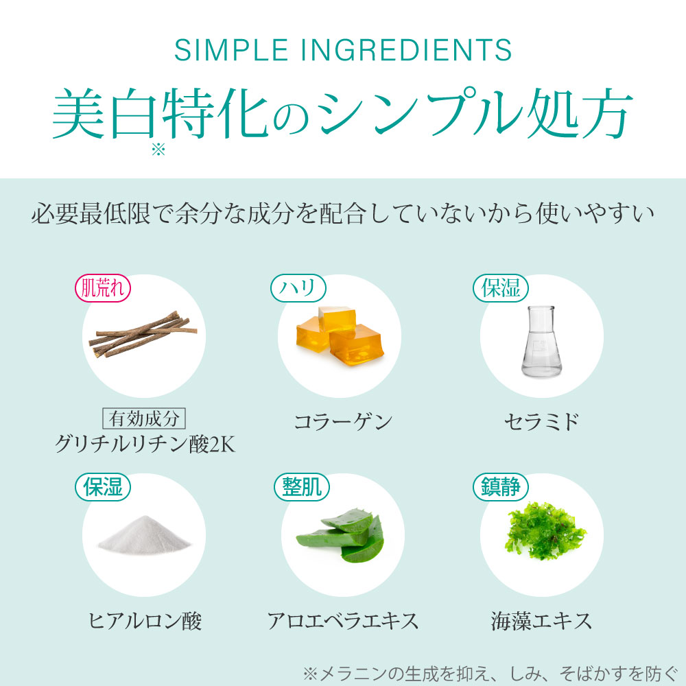 その他の成分:水溶性コラーゲン液(4)、ヒアルロン酸Na-2、コメヌカスフィンゴ糖脂質、水素添加大豆リン脂質、水素添加大豆リゾリン脂質、アロエエキス(2)、海藻エキス(4)、加水分解ゼラチン末、BG、カルボキシビニルポリマー、DL-PCA・Na液、POEラウリルエーテル、濃グリセリン、1,2-ペンタンジオール、メチルパラベン、pH調整剤
